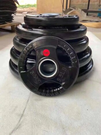 Professional 3-hole black rubber coated dumbbell bumper plates, ideal for gym barbell weight training. Durable rubber coating protects floors and reduces noise, suitable for both home and commercial gyms.