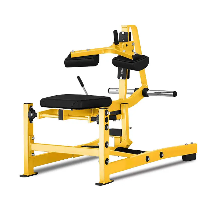A commercial-grade seated calf trainer designed for strength training, ideal for gyms and fitness centers. Features plate-loaded resistance for effective calf muscle development.