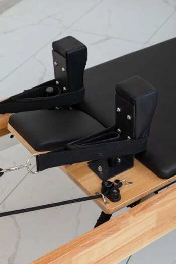 Premium oak frame Pilates Cadillac Bed, ideal for home fitness training. Professional-grade equipment designed to enhance exercise routines, suitable for both beginners and advanced users seeking effective Pilates workouts at home.